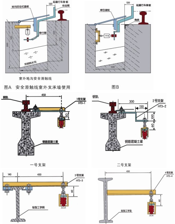 室外安全滑触线地沟结构:垂直安装图A、侧面安装图B、地沟活动盖板,每0.5米/块盖合整个地沟,支架为基建时一次性建筑。